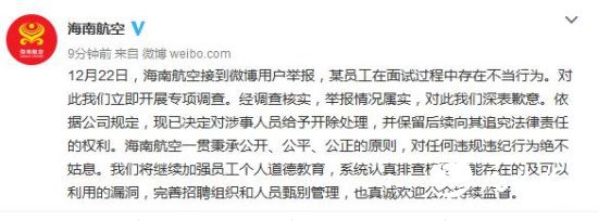 海南航空股份有限公司官方微博今日下午发布消息称,12月22日,海南航空接到微博用户举报,某员工在面试过程中存在不当行为。