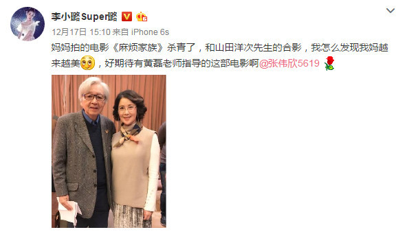 腾讯娱乐讯 12月17日,李小璐在微博晒出妈妈与山田洋次先生的合影,并发文:“妈妈拍的电影《麻烦家族》杀青了,和山田洋次先生的合影,我怎么发现我妈越来越美,好期待有黄磊老师指导的这部电影啊”