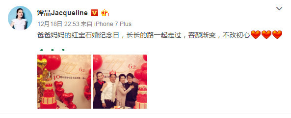 谭晶为父母庆祝结婚纪念日