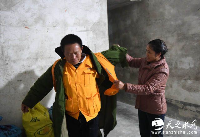 在廖成根出门去工作前,妻子在给他整理衣服(12月6日摄)。