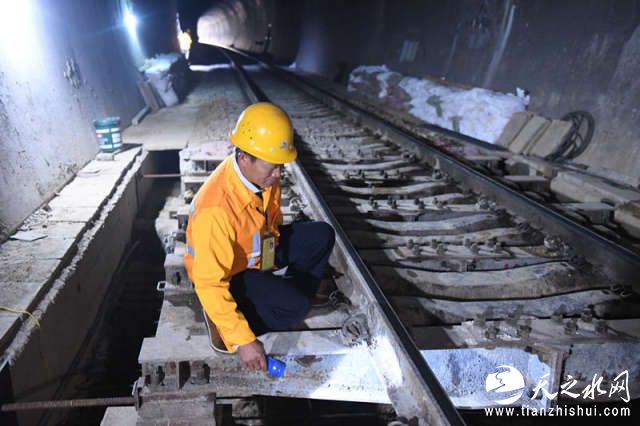 廖成根在邓山隧道内检查铁轨状况(12月6日摄)。