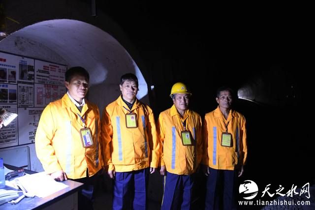 邓山隧道看守工人廖成根(左一)、韦吉叁(左二)、尹彩文(右二)、梁志辉在邓山隧道内合影(12月6日摄)。