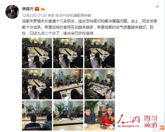 “成都市委副书记、代市长罗强邀请十几名网友,座谈怎样面对和解决雾霾问题。会上,网友发言都十分坦承。希望这样的官民互动越来越多,希望成都的空气质量越来越好。”当晚,应邀参加了此次座谈会的四川省政协委员、建川博物馆馆长樊建川发了一条微博。