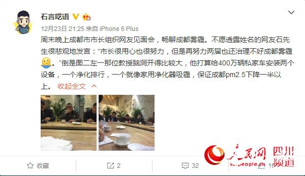 “周末晚上成都市市长组织网友见面会,畅聊成都雾霾。不愿透露姓名的网友石先生很悲观地发言:市长很用心也很努力,但是再努力两届也还治理不好成都雾霾。倒是图二左一那位教授脑洞开得比较大,他打算给400万辆私家车安装两个设备,一个净化排行,一个就像家用净化器吸霾,保证成都pm2.5下降一半以上。”当天晚上9点25分,座谈会进行到一半多时,受邀参会的网友“石言呓语”在自己的微博上发出了这么一条信息。