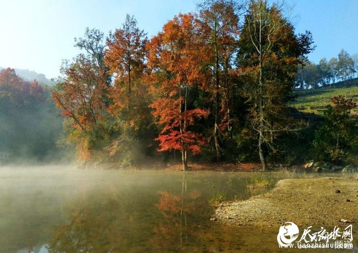 人民网乐业12月25日电进入深冬,广西乐业县罗妹广场、六为水库、上岗水库、大利水库、同乐镇常仁村、西凤坳等地的漫山枫叶便渐次变红,惹人兴奋,红色枫叶成为乐业冬日季节的主色调。广场上,釉红深邃的枫叶将深灰色的大地装饰成一个火热的橙色世界;水库边,魅惑血红的枫叶将静谧的湖面装扮成一个唯美宁静的火红枫岛,远远望去,就像飘动的红绸,燃烧的火焰,灿若红霞,十分诱人,一阵阵轻风吹来,那凋零的枫叶随着微风漫漫飞舞,美哉!美哉!(庞革平、吴宗航)