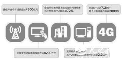苗圩介绍说,今年,通信产业完成投资超过4300亿元,全国所有地市基本建成光纤网络城市,光纤宽带用户占比达到72%,4G用户突破7亿户,全国IPTV(交互式网络电视)用户已达8200万户;全国固定宽带平均接入速率达到2015年的2倍;新增3个互联网骨干直连点,网间带宽新扩容950G。