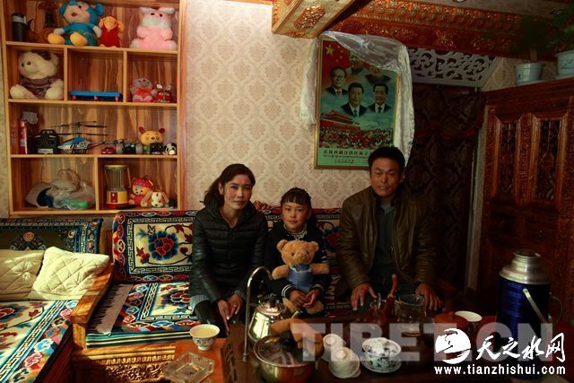 孙思库(右)与妻子卓玛以及8岁的女儿。摄影:陈卫国