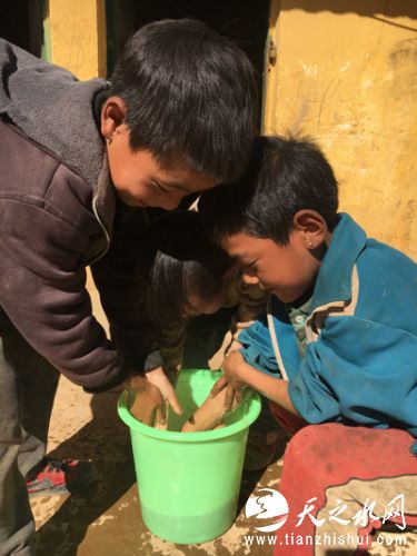 2016年10月24日上午,在美姑县巴普镇塔千村小学课间休息时,几名学生正在教室外洗手陈地摄