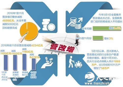 据统计,5月至11月,四大新纳入试点行业累计减税1105亿元,税负下降14.7%。1月至11月营改增减税4234亿元。考虑到城建税及教育费附加和个人二手房减税因素,1月至11月营改增带来的整体减税已达到4699亿元,全年减税5000亿元的目标将能实现。