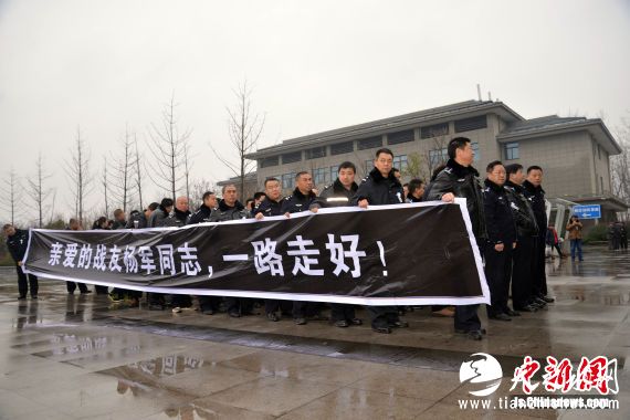 12月26日,徐州的天空下着淋漓的小雨,来自全市公安战线上的战友们冒雨赶到殡仪馆,有人拿着条幅“亲爱的战友杨军同志,一路走好!”为杨军送行。(完)
