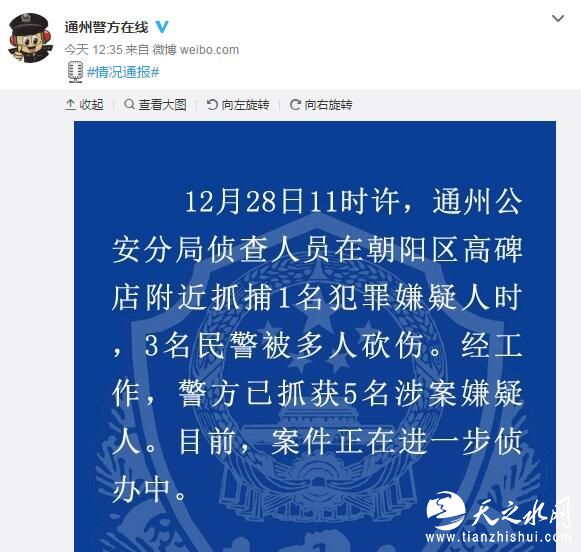 北京通州3民警抓捕一嫌犯时被多人砍伤 警方已抓获5人 2016-12-29 15:50 我要评论0 人民网北京12月29日电据北京市公安局通州分局官方微博消息,12月28日11时许,通州公安分局侦查人员在朝阳区高碑店附近抓捕1名犯罪嫌疑人时,3名民警被多人砍伤。经工作,警方已抓获5名涉案嫌疑人。 目前,案件正在进一步侦办中。 微笑 流汗 难过 羡慕 愤怒 流泪 复制网址 打印 收藏 0