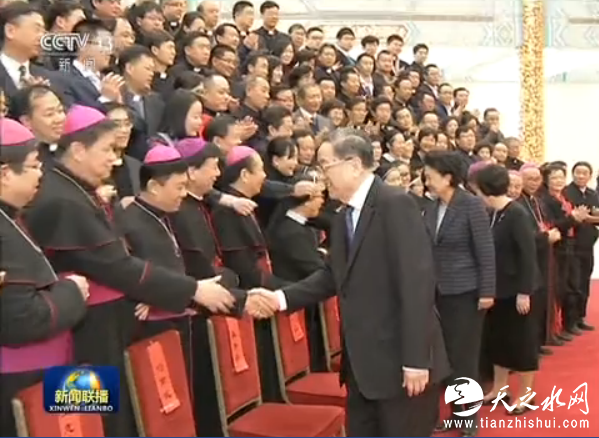 央视网消息(新闻联播):中共中央政治局常委、全国政协主席俞正声今天在人民大会堂会见了中国天主教爱国会、中国天主教主教团新一届领导班子成员,并与出席中国天主教第九次全国代表会议的代表合影留念。
