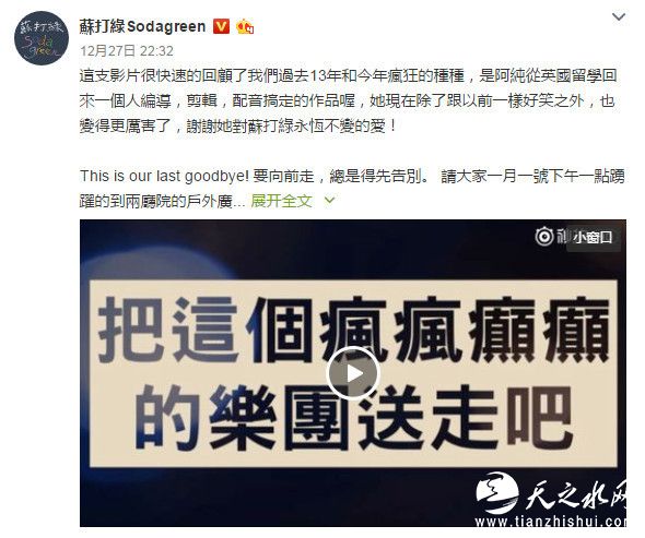 腾讯娱乐讯 12月27日,台湾摇滚乐团苏打绿通过微博晒出一段视频,并发文:“这支影片很快速的回顾了我们过去13年和今年疯狂的种种,是阿纯从英国留学回来一个人编导,剪辑,配音搞定的作品喔,她现在除了跟以前一样好笑之外,也变得更厉害了,谢谢她对苏打绿永恆不变的爱!This is our last goodbye! 要向前走,总是得先告别。 请大家一月一号下午一点踊跃的到两厅院的户外广场,把这个即将休息三年疯疯癫癫的乐团送走吧!”