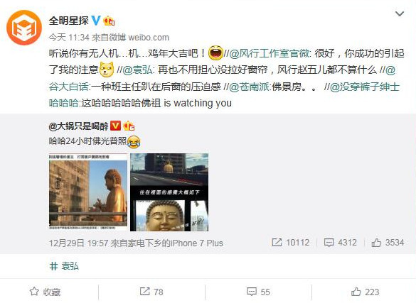 30日,袁弘在转发微博上,附文:“再也不用担心没拉好窗帘,风行赵五儿都不算什么。”而他所转发的微博配图为一正对一尊佛像的在建大楼,该微博写道:“哈哈,24小时佛光普照。”照片显示,佛像离大楼不远,且正面向向。