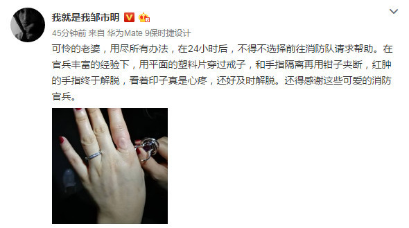 腾讯娱乐讯 昨日(1月5日),邹市明的妻子冉莹颖晒出一组手指被戒指卡住的照片,并感谢了消防队员为她解决了这个难题。但这件事却引起了网友的争议,邹市明力挺妻子,发文称冉莹颖是“用尽所有办法,在24小时后,不得不选择前往消防队请求帮助”。