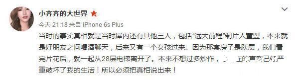 齐琦在微博中写道,“当时的事实真相就是当时屋内还有其他三人,包括“远大前程”制片人董盟,本来就是好朋友之间喝酒聊天,后来又有一个女孩过来。因为那套房子是跃层,我们看完片花后,就一起从28层电梯离开了。本来不想过多炒作,但现在的声音已经严重破坏了我的生活!所以必须把真相说出来! ”