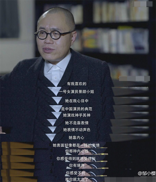 腾讯娱乐讯 近日,主持人梁文道在一档节目里讨论景甜的话语引发关注,他称:“有我喜欢的一号女演员景甜小姐,她在我心目中是中国演员的典范,她演戏神乎其神,她不是靠表情,她表情不动声色,她靠内心,她表面好像都是一样的表情,但那种内心戏,你感受得到就感受得到你有境界,你感受不到,那你就太次了。”