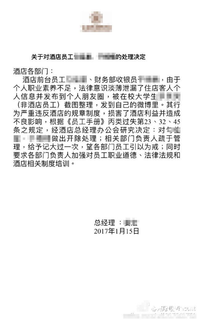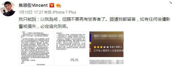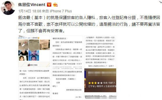 焦恩俊PO文写道:“饭店最基本的是保护旅客的个人隐私,旅客入住登记身份证,不是随便因为你喜不喜欢,崇不崇拜就可以公开炫耀的,这是触法的行为,请不要再当法盲了。”而饭店总经理立即写信道歉,2名违规员工已经被开除,相关主管也以记大过惩处。