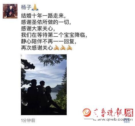 黄圣依生二胎儿子 杨子发文感恩妻子十年隐忍 2017-01-27 22:14 来源:中国日报网 作者:作者: 22日下午,黄圣依在加拿大温哥华顺产一个健康的男宝宝,母子平安,丈夫杨子在一旁全程细心陪护。继2012年两人喜得一子Andy后,此番家中再添一子,夫妻俩的喜悦之情溢于言表。 微笑 流汗 难过 羡慕 愤怒 流泪 相关阅读 关键词: 王菲 责任编辑:赵安生 复制网址 打印 收藏 0