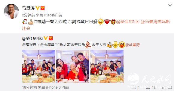 马景涛妻子晒全家春节团圆照 教主两儿子颜值高 2017-01-28 12:58 来源:腾讯娱乐 作者:作者: 马景涛妻子吴佳妮今日(1月28日)晒出全家吃团圆饭的照片。马景涛吴佳妮与两个孩子及长辈亲戚均在,画面温馨和谐、喜乐祥和。马景涛转发了妻子的微博,两人还说了不少拜年吉祥话“金鸡报喜、金玉满堂”。 微笑 流汗 难过 羡慕 愤怒 流泪 相关阅读 关键词: 歌手 冠名 伊利 娱乐营销 责任编辑:赵安生 复制网址 打印 收藏 0