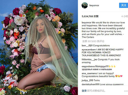 腾讯娱乐讯 2月2日消息,美国天后Beyonce在IG宣布自己再度有喜的消息,而且怀的还是双胞胎,可谓双喜临门。Beyonce写到:“我们好高兴同大家分享这份喜悦。而且可能要两份祝福,因为我们家好快就会增加两名成员了!谢谢大家的祝福!”