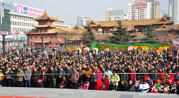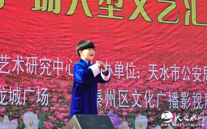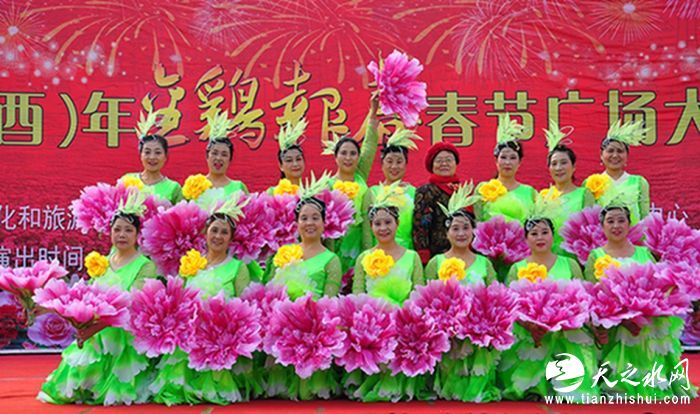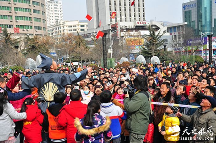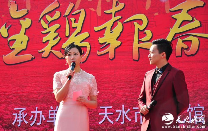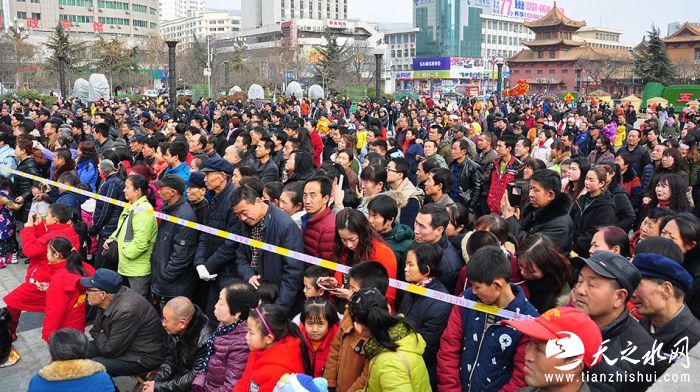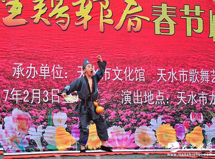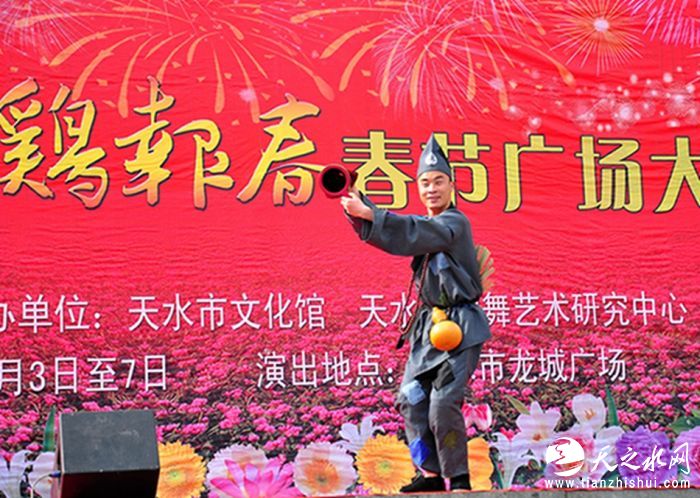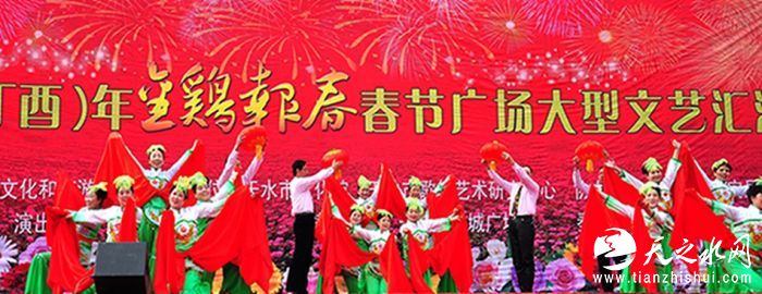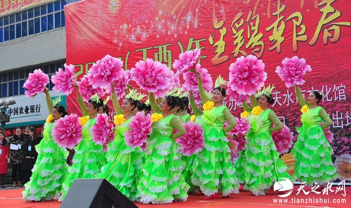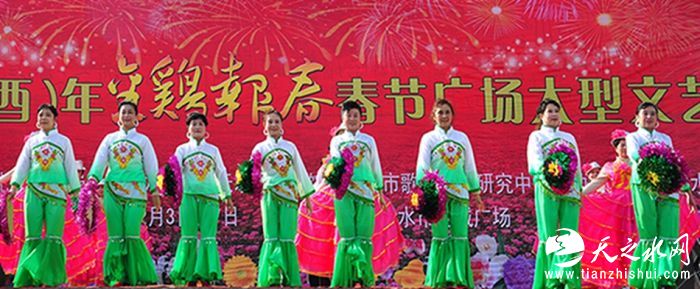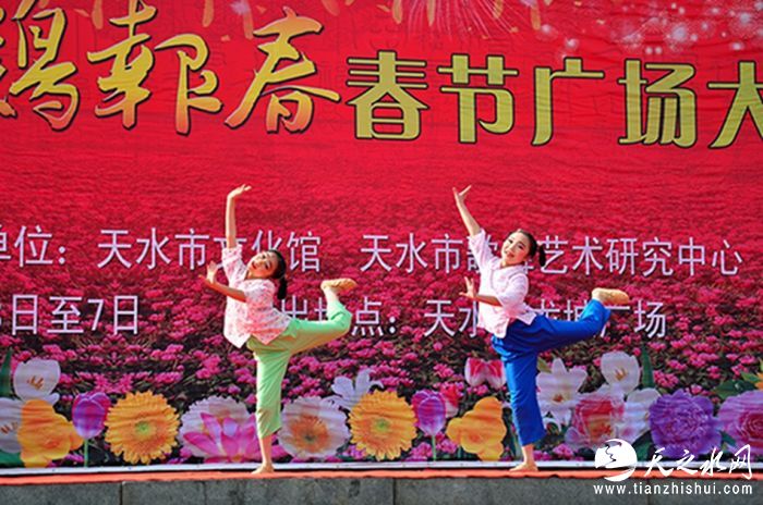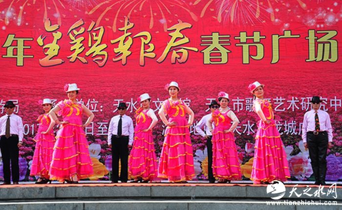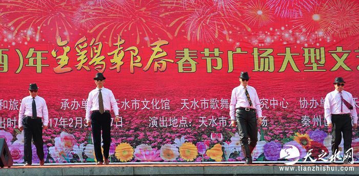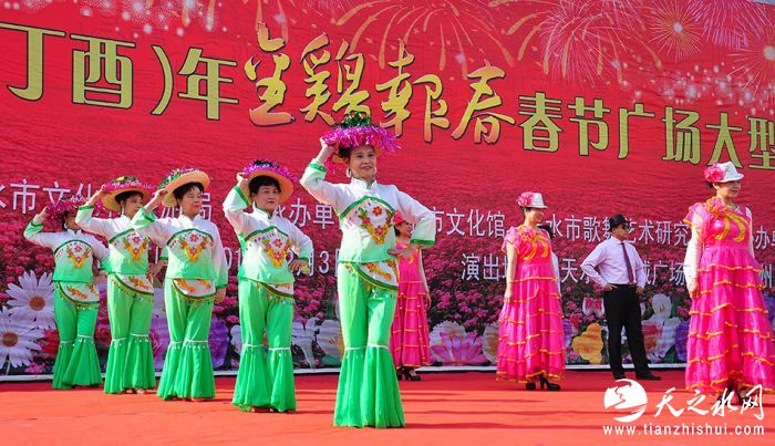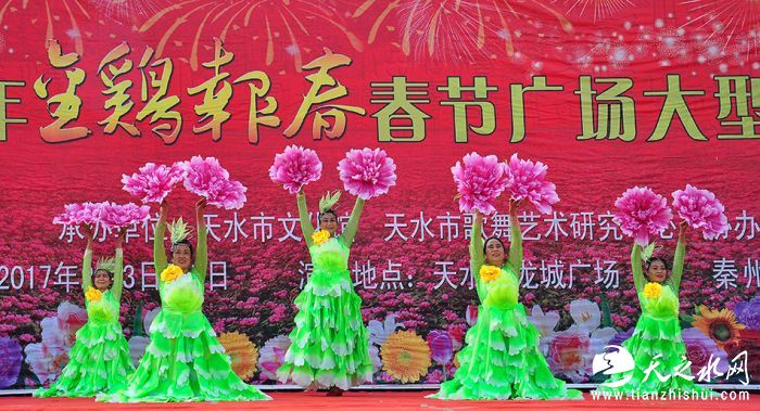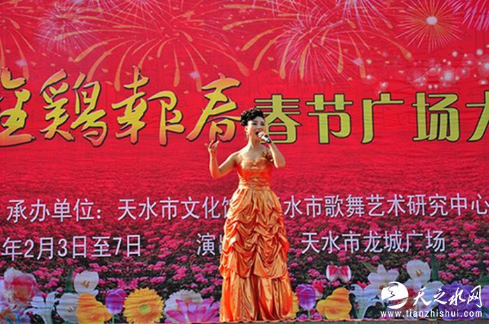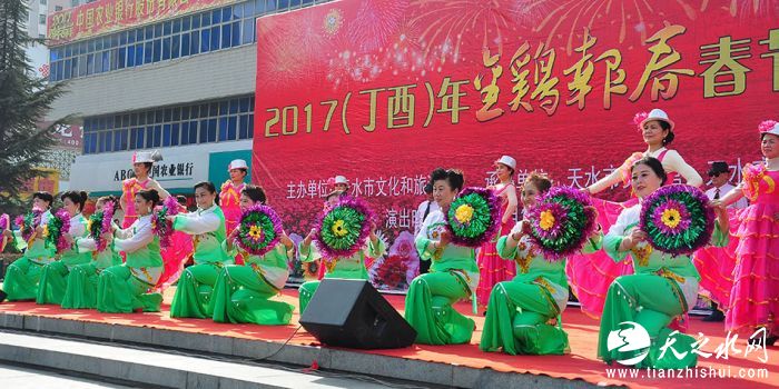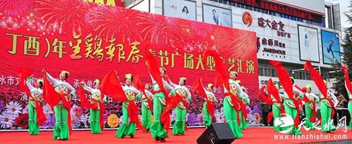 2月3日,农历正月初七日,由天水市文化和旅游局主办,天水市文化馆、天水歌舞艺术研究中心承办的2017“金鸡报春”春节广场文艺演出今日拉开序幕。当日的演出中,舞蹈、声乐、器乐、诗朗朗等节目轮番上演 天水风尚艺术团的精彩节目开门红,三月三,天河热土深受大家的欢迎。,精彩的演绎博得了广场众多观众的热烈掌声,为节日的市民们增添了气氛。