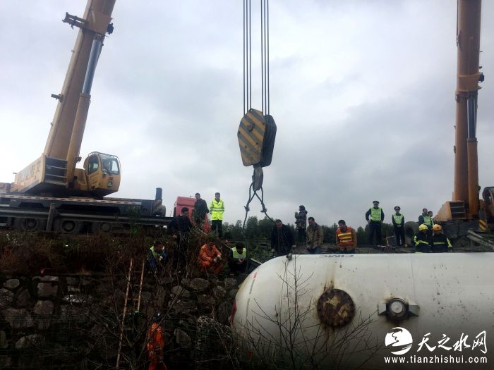 装有22.5吨丙烯的槽罐车总体重量近50吨,甬台温高速公路管理处连夜从相关部门调来二辆大型吊车,对侧翻槽罐车进行吊装。为防止吊装过程中发生碰撞、产生火花,消防官兵采用水枪对槽罐车罐体进行喷射降温措施,确保槽罐车罐体在吊装过程中的安全。经过多方努力,槽罐车被安全地吊装到高速路面,并在救援车辆的牵引下,驶离事故区域。甬台温高速公路管理处联合高速交警、临海消防大队驾驶救援车辆一路护送,将槽罐车安全送至台州高速服务区。经过严格的安全检查,在确认槽罐车罐体安全后,换上了运输公司派来的车头,由运输公司将槽罐车转运送到宁波厂家进行卸货倒槽。