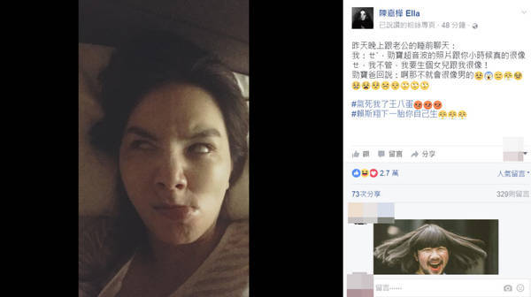 Ella睡前习惯和老公谈天,她表示看完劲宝超声波照片,直呼跟老公小时候长得相当神似,便娇羞跟老公预约要生第二胎,而且还是要生个长得很像的女儿,未料老公竟回“那不就会很像男的”,这让Ella瞬间大动肝火,不仅大骂老公“王八蛋”,还指名道姓要他下胎自己生,对此粉丝直呼夫妻间的对话好可爱,根本就是在放闪。