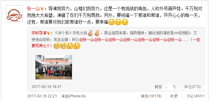 2月16日,张一山新戏开机,新戏导演在微博中称:“开机大吉,男主组团来袭,强势撩妹。据说他的演技是ssr级别的,艾特他会吸粉,而且会瘦,所以@张一山@张一山@张一山@张一山@张一山@张一山@张一山……(一定要写满七个)”十分的俏皮。