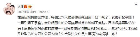 大S在微博中写道“在这自媒体的世界里,每个公众人物都想放飞自我!但一飞了,就会引起争议!一旦引起了争议,当你想关注的公众议题就会被模糊了焦点,因此很难再取信于民!这是个取舍两难的选择,到底要做个牺牲自我的模范生?还是既能自由放飞又能取信于大众的公众人物,完全取决于你长久累积的成绩单。难!”