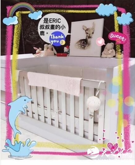 林心如透露:“我真的也没有一定要把房间布置成粉红色啦!”有别于小女婴搭粉红色的绝配组合,她则是选择将婴儿床、周边布置成白色,床框旁放着各种小兔娃娃,还有一幅画,“是ERIC叔叔画的小鹿。”