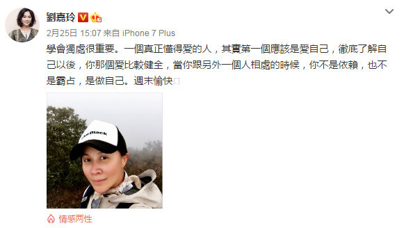 腾讯娱乐讯 2月25日,刘嘉玲在微博晒出一张独自登山的素颜照,并发文:“学会独处很重要。一个真正懂得爱的人,其实第一个应该是爱自己,彻底了解自己以后,你那个爱比较健全,当你跟另外一个人相处的时候,你不是依赖,也不是霸占,是做自己。周末愉快。”