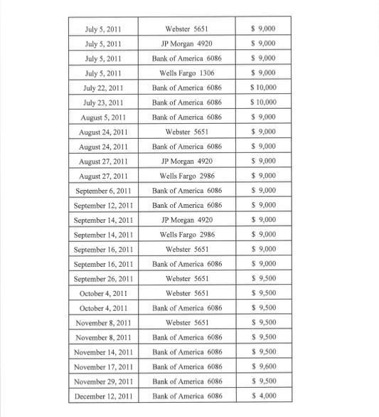 在起诉书中显示,英达曾经在同一天给四个不同的银行存入等额,但都小于1万美元的现金存款。比如记录显示,2011年7月5日,英达就给四个隶属不同银行的账户,均存入等额的9000美元,这也就意味着每个银行都不需要给监管部门报备,但实际存入现金的总额远高于1万美元。调查人员统计,在2011年间,英达通过38个类似的现金交易在美国的银行存入35万6千8百美元,又在2012年,通过12个类似的现金交易在美存入11万7千6百美元,总计46万四千四百美元。