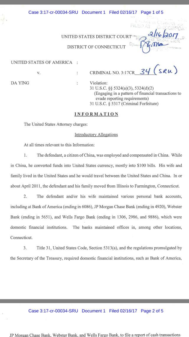 腾讯财经讯 (文/康路 王丹薇 发自纽约)2017年2月17日,美国康涅狄格州检察院发布公告,称一位56岁的中国公民Da Ying在康涅狄格州认罪,承认自己涉嫌对金融交易进行瞒报。根据腾讯娱乐报道,此中国公民为知名导演英达。而英达尚未公开回应。
