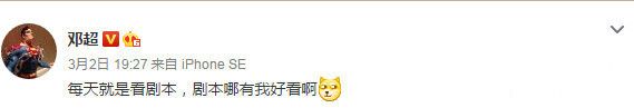 邓超发文称:“每天就是看剧本,剧本哪有我好看啊。”随后又评论道“一天了没正眼看过我”、“我去带孩子了”。