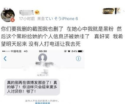 该粉丝后来发了微博,劝自己不要再犯贱,而后该粉丝删除了微博,并表示因为个人信息被挂,她收到了骚扰信息。