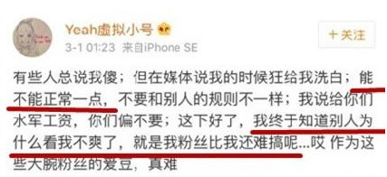 之后,不少粉丝选择脱粉,3月1日,郑爽再发微博,称粉丝难搞,劝粉丝能不能正常一点。