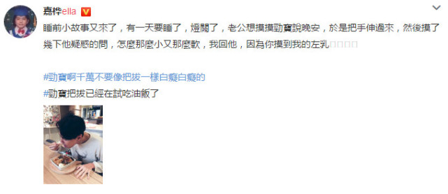 腾讯娱乐讯 昨日,孕妈Ella在微博中分享睡前小故事,称“有一天要睡了,灯关了,老公想摸摸劲宝说晚安,于是把手伸过来,然后摸了几下他疑惑的问,怎么那么小又那么软,我回他,因为你摸到我的左乳”。