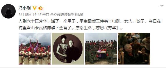 腾讯娱乐讯 3月18日下午,导演冯小刚发文庆祝自己的虚岁60岁生日,他发微博晒出新片《芳华》片场照,以及与妻子徐帆的合影,感叹:“人到六十正芳华,活了一个甲子,平生最爱三件事:电影、女人、饺子。今日在梅里雪山卡瓦格博峰下全有了。感恩生命,感恩《芳华》。 ”