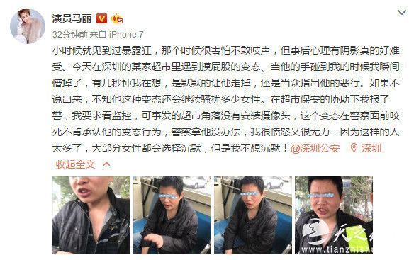 马丽在微博中写道:“今天在深圳的某家超市里遇到摸屁股的变态、当他的手碰到我的时候我瞬间懵掉了,有几秒钟我在想,是默默的让他走掉,还是当众指出他的恶行。如果不说出来,不知他这种变态还会继续骚扰多少女性。在超市保安的协助下我报了警,我要求看监控,可事发的超市角落没有安装摄像头,这个变态在警察面前咬死不肯承认他的变态行为,警察拿他没办法,我很愤怒又很无力…因为这样的人太多了,大部分女性都会选择沉默,但是我不想沉默!”