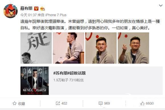苏有朋向粉丝“比心”表白:一切如昔 真心美好 2017-03-26 11:36 来源:腾讯娱乐 作者:作者: 今日(3月25日)凌晨,苏有朋在微博感慨自己路演的感受,还晒照向粉丝“比心”,表示感谢。 苏有朋微博原文:“这几年说幕后就埋头幕后。未曾细想,这对用心陪我多年的朋友在情感上是一种自私。幸好这次电影路演,还能看到好多熟悉的你。一切如昔,真心美好。” 微笑 流汗 难过 羡慕 愤怒 流泪 责任编辑:赵安生 复制网址 打印 收藏 0