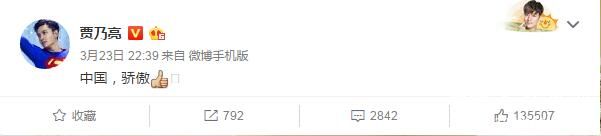 在得知国足胜利的消息后,贾乃亮在微博发文:“中国,骄傲。”并配上一个竖大拇指的表情,为国足加油。