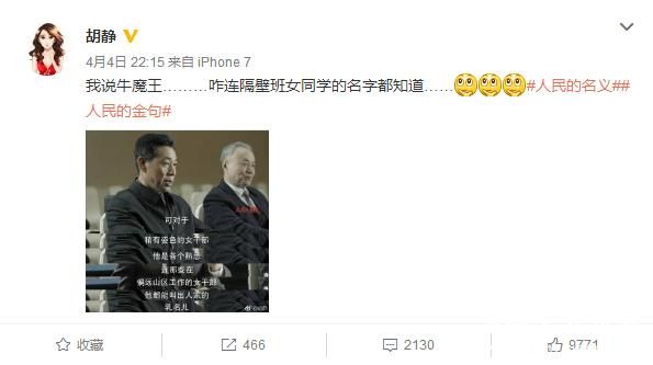 腾讯娱乐讯 4月5日晚,胡静在网络上发出一张热播电视剧《人民的名义》截图,图为电视剧中沙书记暗讽个别领导干部对本职工作不上心,却能叫出偏远山区工作的女干部的乳名儿。胡静配文调侃儿子牛魔王:“难怪隔壁班女同学的名字都知道...”网友看到后纷纷加入调侃的队伍:“牛魔王有当领导的潜质啊”,“现在的小孩子懂的真是很多呢”。