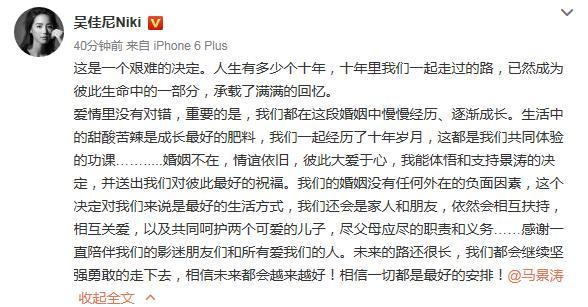 吴佳尼发文道:“这是一个艰难的决定。人生有多少个十年,十年里我们一起走过的路,已然成为彼此生命中的一部分,承载了满满的回忆。爱情里没有对错,重要的是,我们都在这段婚姻中慢慢经历、逐渐成长。生活中的甜酸苦辣是成长最好的肥料,我们一起经历了十年岁月,这都是我们共同体验的功课……婚姻不在,情谊依旧,彼此大爱于心,我能体悟和支持景涛的决定,并送出我们对彼此最好的祝福。我们的婚姻没有任何外在的负面因素,这个决定对我们来说是最好的生活方式,我们还会是家人和朋友,依然会相互扶持,相互关爱,以及共同呵护两个可爱的儿子,尽父母应尽的职责和义务……感谢一直陪伴我们的影迷朋友们和所有爱我们的人。未来的路还很长,我们都会继续坚强勇敢的走下去,相信未来都会越来越好!相信一切都是最好的安排!@马景涛”