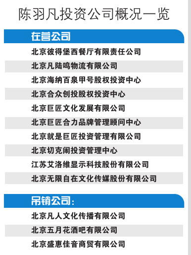 除此之外,据公开资料显示,陈羽凡自己创立的公司凡人文化自成立之后,除了签约瘦人乐队并推出一张新专辑外,多年以来在经营方面并无其他大动作。而2011年,瘦人乐队也离开凡人文化,签约了独立唱片公司“树”音乐。北京商报记者登录国家企业信用信息公示系统发现,2012年11月凡人文化被吊销营业执照。此外,陈羽凡参投的北京盛惠佳音商贸有限公司、北京五月花酒吧有限公司,也分别在2007年12月、2010年12月被吊销营业执照。