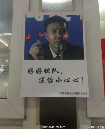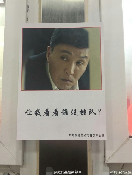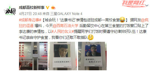 腾讯娱乐讯 28日,有网友在微博晒出达康书记的表情包进驻成都一高校食堂的照片,提醒同学们在打饭的时候要自觉排队,遵守纪律。