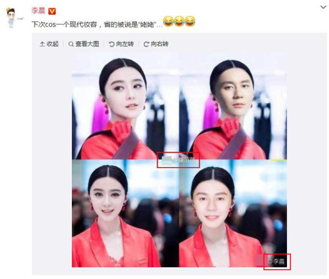 李晨在微博上晒出自己与女友的对比照,并写道:“下一次cos一个现代妆容,省的(得)被说是‘姥姥’…。”