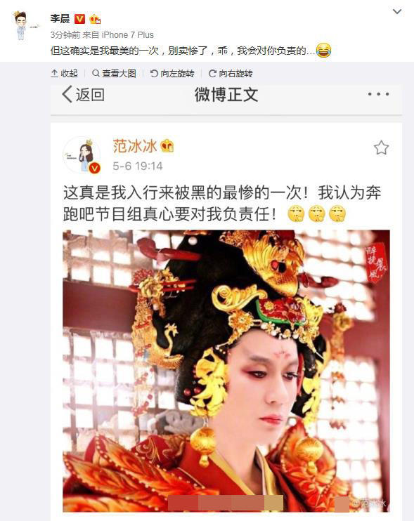不久后,范冰冰再度晒出一张PS照,帮李晨再度换脸变成武媚娘。范冰冰留言道:“这真是我入行来被黑的最惨的一次!我认为奔跑吧节目组真心要对我负责任!”