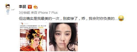 随后李晨转发范冰冰微博截图,并配上一张范冰冰可怜兮兮的剧照。李晨还写道:“但这确实是我最美的一次,别卖惨了,乖,我会对你负责的…”