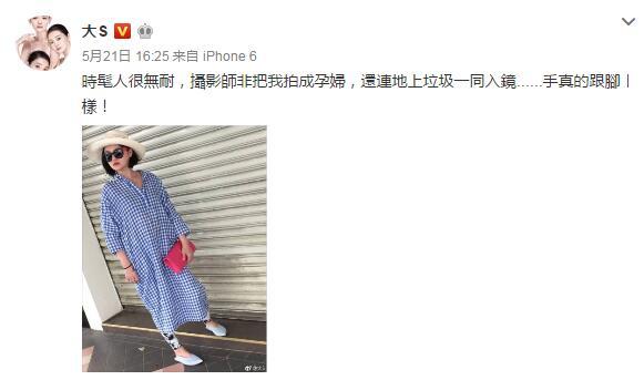 腾讯娱乐讯 5月21日,大S在微博晒出自己的近照,但照片中的她却看上去肚子凸起,疑似孕妇,整个人也看上去很矮,她无奈发文:“时髦人很无耐(无奈),摄影师非把我拍成孕妇,还连地上垃圾一同入镜。手真的跟脚一样!”